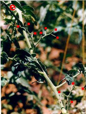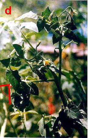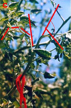 recourbent à leur extrémité (photo c et d), gonflement des rameaux en chapelets non réguliers (photo b),