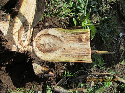 ![]() Les symptômes sont le flétrissement des feuilles, et la mort du plant de bananier. L'infection se propage aux rejets. Comme pour toutes la maladies systémiques, l'agent pathogène se propage par le système vasculaire et s'accompagne de colorations brun-noir bien visibles sur les coupes du faux tronc.