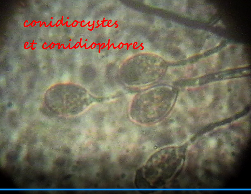 L'esquisse, à gauche, explique le déroulement de l'élaboration des conidiocystes,