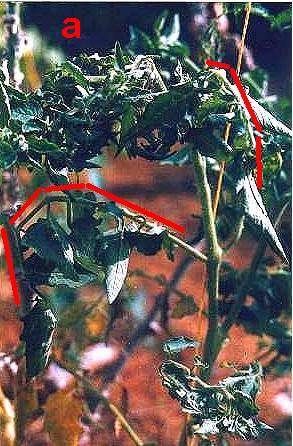 recourbent à leur extrémité (photo c et d), gonflement des rameaux en chapelets non réguliers (photo b),