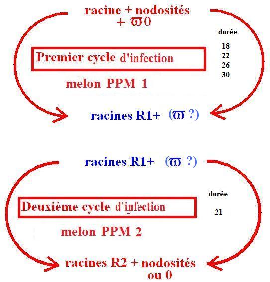 ![]() Généralement les nématologistes font cette étude partant d'un stade larvaire J2 (juvenile de stade2)jusqu'à l'obtention de nouvelles larves J2. Nous ne disposons pas du matériel permettant la manipulation des nématodes ; aussi avons-nous opté pour la définition du cycle oeufs vers oeufs, avec l'outil plantules pièges de melon reproduit deux fois la première inoculation (désignée comme PPM 1) prolongée pour 4 durées arbitraires de 18, 22, 26, et 30 jours, la seconde (désignée comme PPM 2) vérifiant que le cycle était obtenu. L'inoculum initial comportant des oeufs a donc consisté en racines de tomates tuméfiées, chargées de masses d'oeufs. Pour l'inoculum des infections secondaires, ce sont les racines des premières plantules de melon qui ont été choisies supposées renfermer une ou plusieurs masses d'oeufs. Le schéma suivant résume cette stratégie ![]()