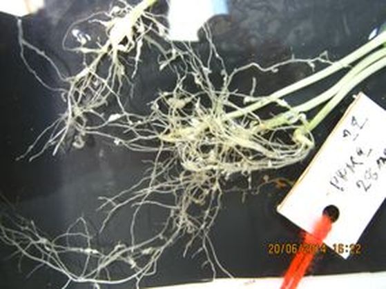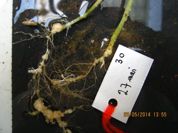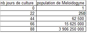 Notre population (il est probable qu'ici comme ailleurs on ait affaire à des populations de plusieurs espèces) de Meloidogyne se reproduit donc à ce rythme très rapide de 22 jours. La biblographie donne des valeurs assez différentes, 1°Ruben GASPASIN (WWW.keys.lucidcentral.org/..../root-knot.htm) propose une durée inférieure à 4 semaines 2° aux Indes, sur canne à sucre VK.MATHUR & KS.VARAPRASAD ont obtenu 39 jours 3°DirK De WAELLE & Romuldo G. DAVIDE (1998) ont trouvé 4-6 semaines pour la durée du cycle 4°A.T.PLOEG & P.C.MARIS ont publié sur Nematology (1999, 1,389-393) leurs résultats évalués à 22-24 jours pour des sols à 30°C ceci pour des larves juveniles Meloidogyne J2 à J2 5° Enfin l'INRA annonce lui aussi 21 jours pour des sols à 28°C. http://www7.inra.fr/hyppz/RAVAGEUR/3melspp.htm Que doivent en penser les maraichers? Le tableau construit sur la base de 250 oeufs par génération ![]() Kourou, 22 JUIN 2014 |