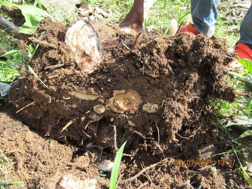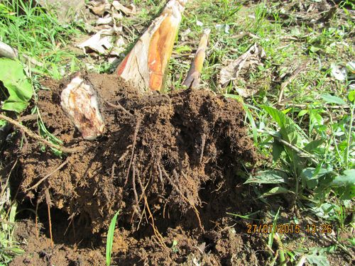 ![]() Les symptômes sont le flétrissement des feuilles, et la mort du plant de bananier. L'infection se propage aux rejets. Comme pour toutes la maladies systémiques, l'agent pathogène se propage par le système vasculaire et s'accompagne de colorations brun-noir bien visibles sur les coupes du faux tronc.